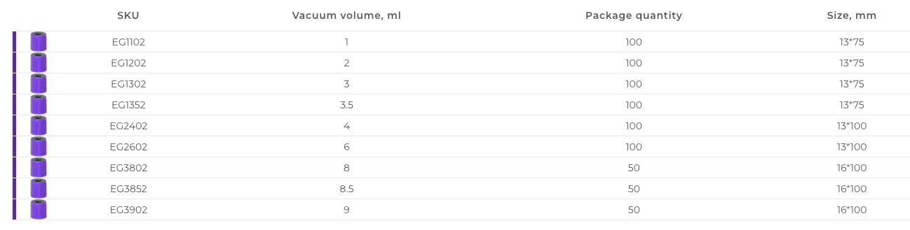Vacuum blood collection tubes for K2 EDTA hematologic testing. These