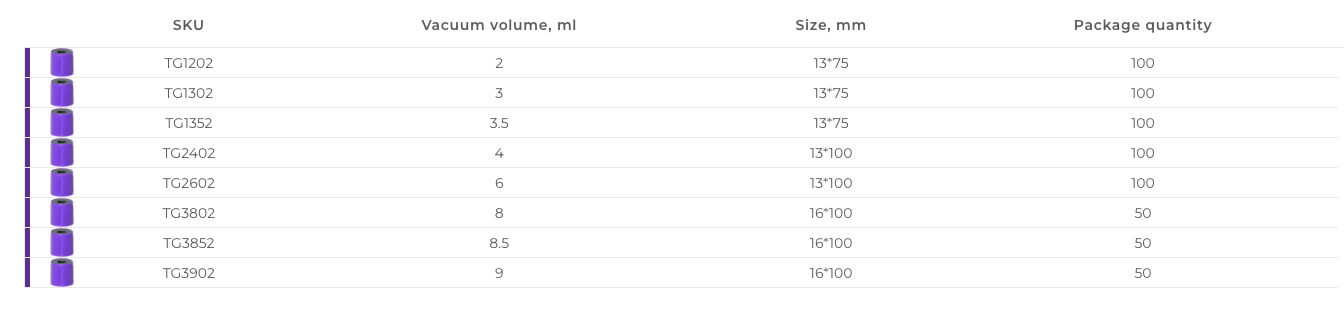 Vacuum blood collection tubes for K3 EDTA hematologic testing. These
