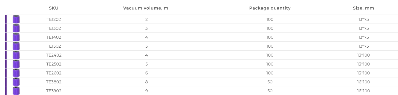 Vacuum blood collection tubes for K3 EDTA hematologic testing. These